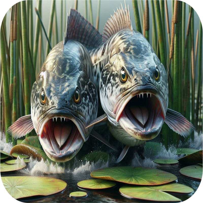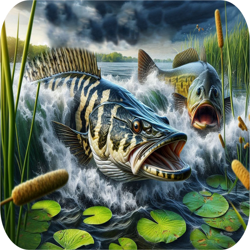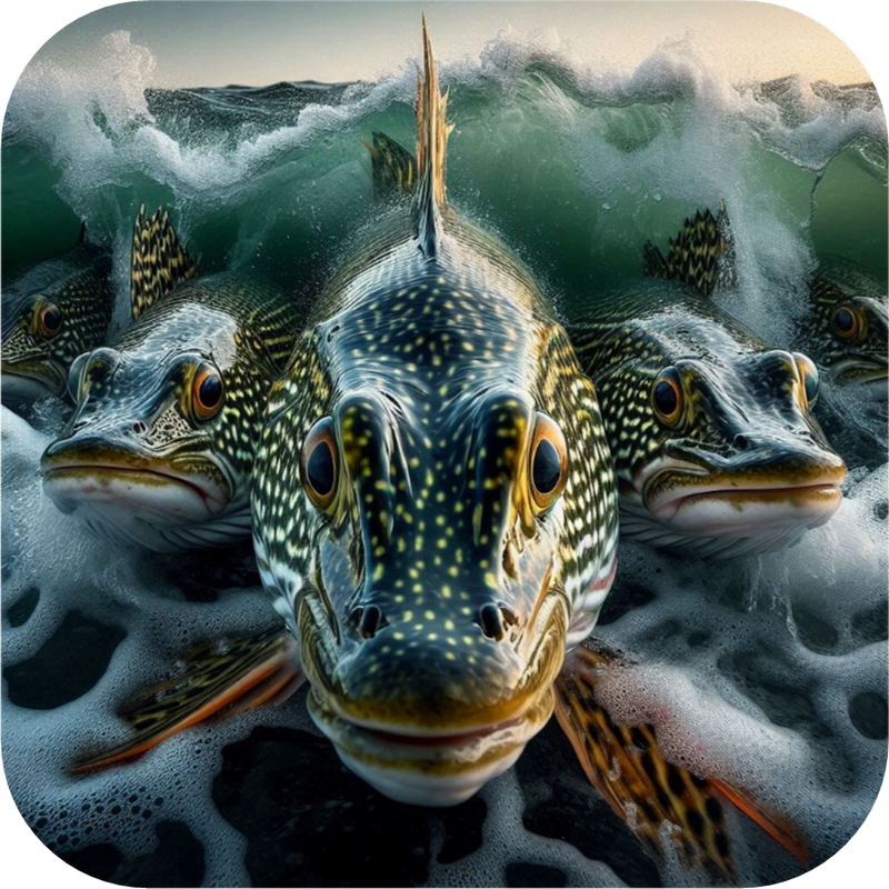 In the back of the lake, where the shallow stumps are, you cast your Pike Pounder. From 10 feet away the water starts to swirl and the V Wake starts heading towards your lure. The hit is a full speed smash. The "Pike Pounder" was designed to hunt Pickerel, Pike, and Musky. The Pike Pounder uses a large or extra large Surface Seducer head combined with a swinging open hook.