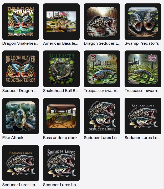 Seducer Lures is proud to offer shirts, apparel, and other items featuring branded Seducer items and our snakehead, bass, and fishing inspired artwork. We are a contributing artist for Tee-Public, one of the largest online made to order apparel services. Shop our designs, place your order, and Tee-Public handles all the printing, delivery, and any issues with the delivered product. Here are some of our featured designs. Tap or click here to visit our full store.